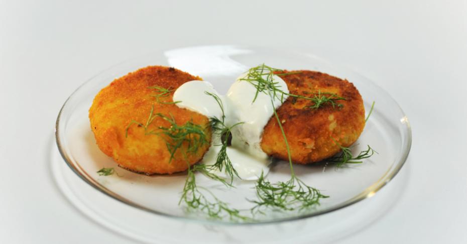 Лук-порей нарежьте кольцами, зеленый лук мелко нарубите, а луковицы — кубиком. Сало тоже нарежьте кубиками и поджарьте на сковороде до получения шкварок. Картофель отварите, измельчите в пюре и смешайте с мукой, тщательно замесите тесто. Стаканом нарежьте тесто на кружочки, в центр каждого поместите немного сала и лука. Обжаривайте биточки в топленом сливочном масле на сковороде.